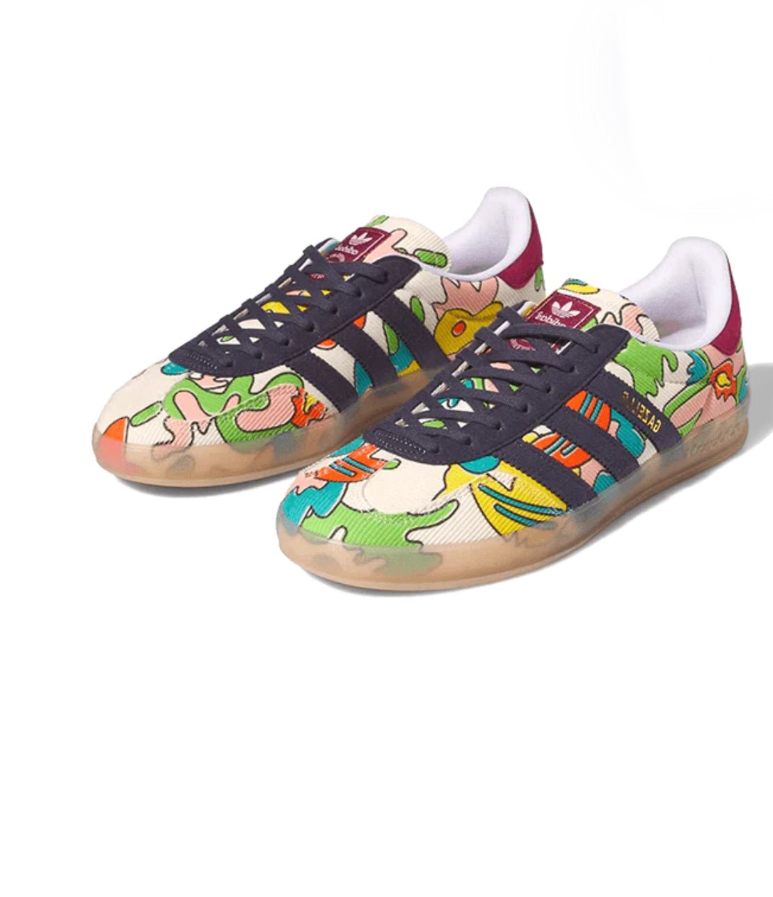 Cette Adidas Gazelle Indoor Sean Wotherspoondévoile une tige en velours côtelé, sublimée par des illustrations colorées rappelant l’art contemporain des années 70. On remarque ensuite les trois bandes caractéristiques de la marque allemande fabriquées en suède bleu marine et accordées aux œillets. Fidèle au modèle indoor, la semelle en gomme translucide remonte légèrement et se confond avec la tige pour conclure ce design audacieux.