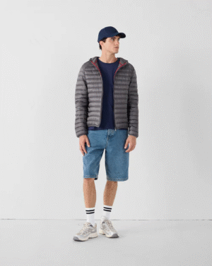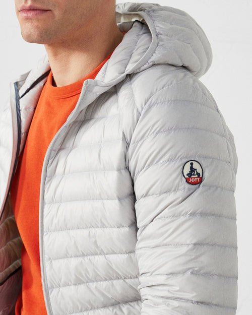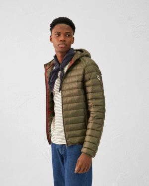 - Détails col avec deux boutons-pression et capuche attenante.